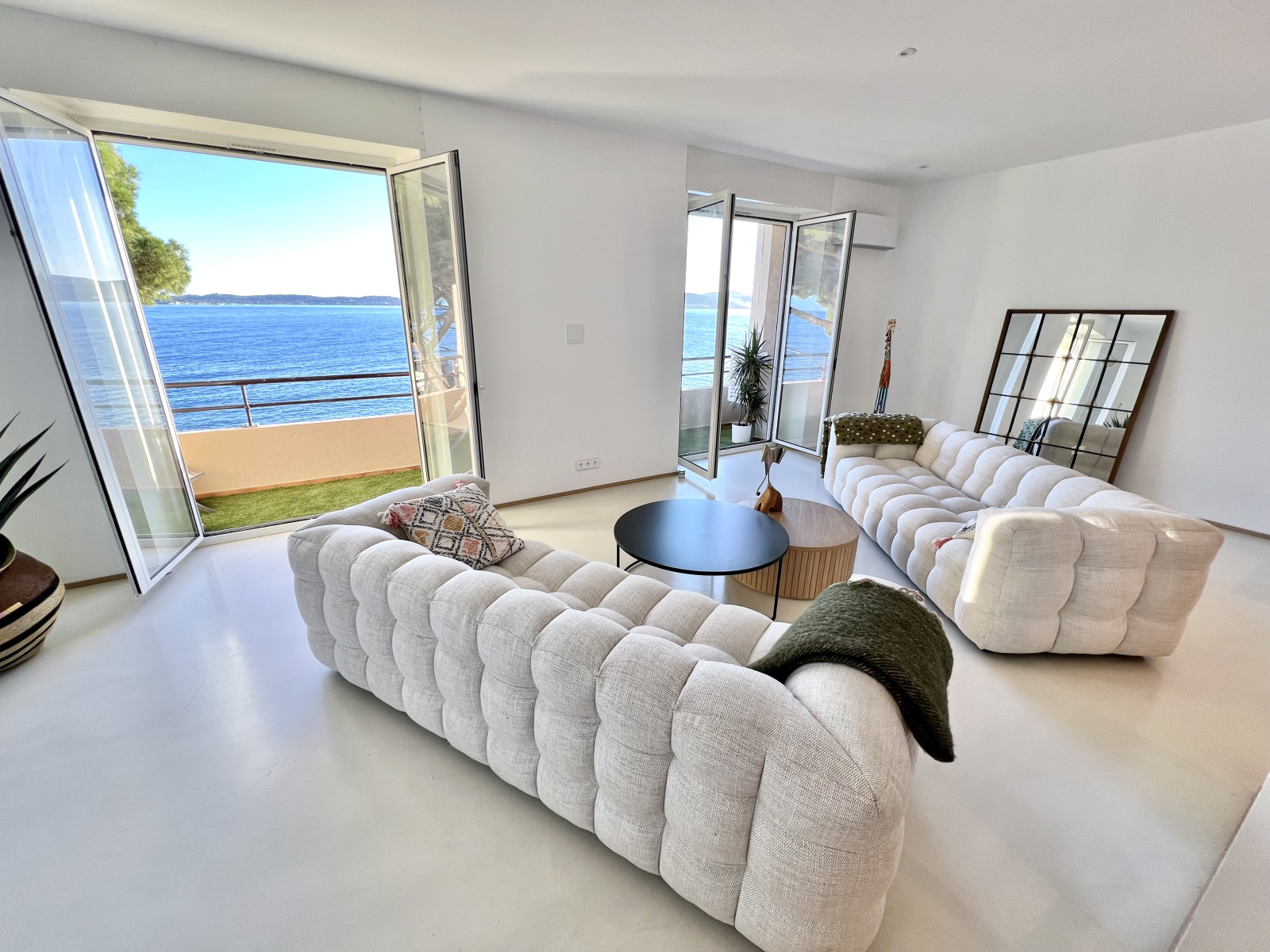 Spacieux appartement de type 4 pièces d'environ 135m2 avec vue mer panoramique sur la baie de Saint-Tropez composé : d'un vaste hall d'entrée avec placards, d'une cuisine à l'américaine équipée avec salle à manger, d'une salle de séjour ouvrant sur un balcon au SUD.