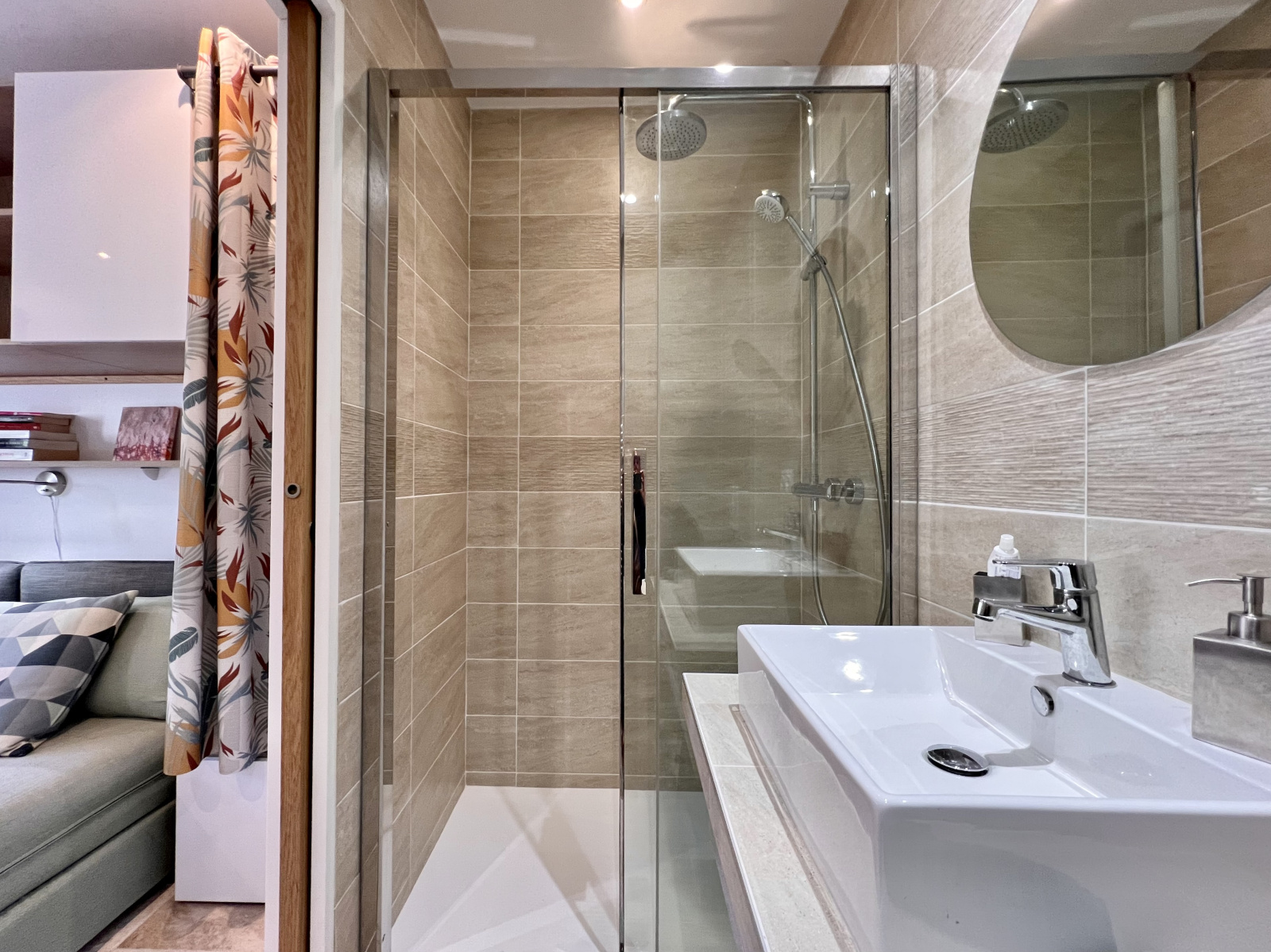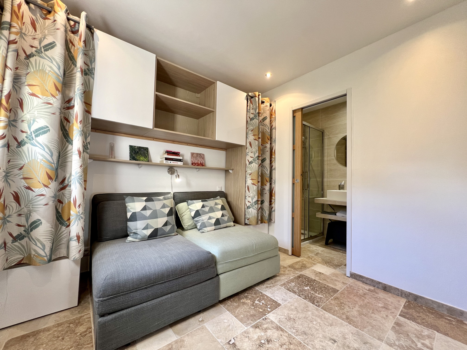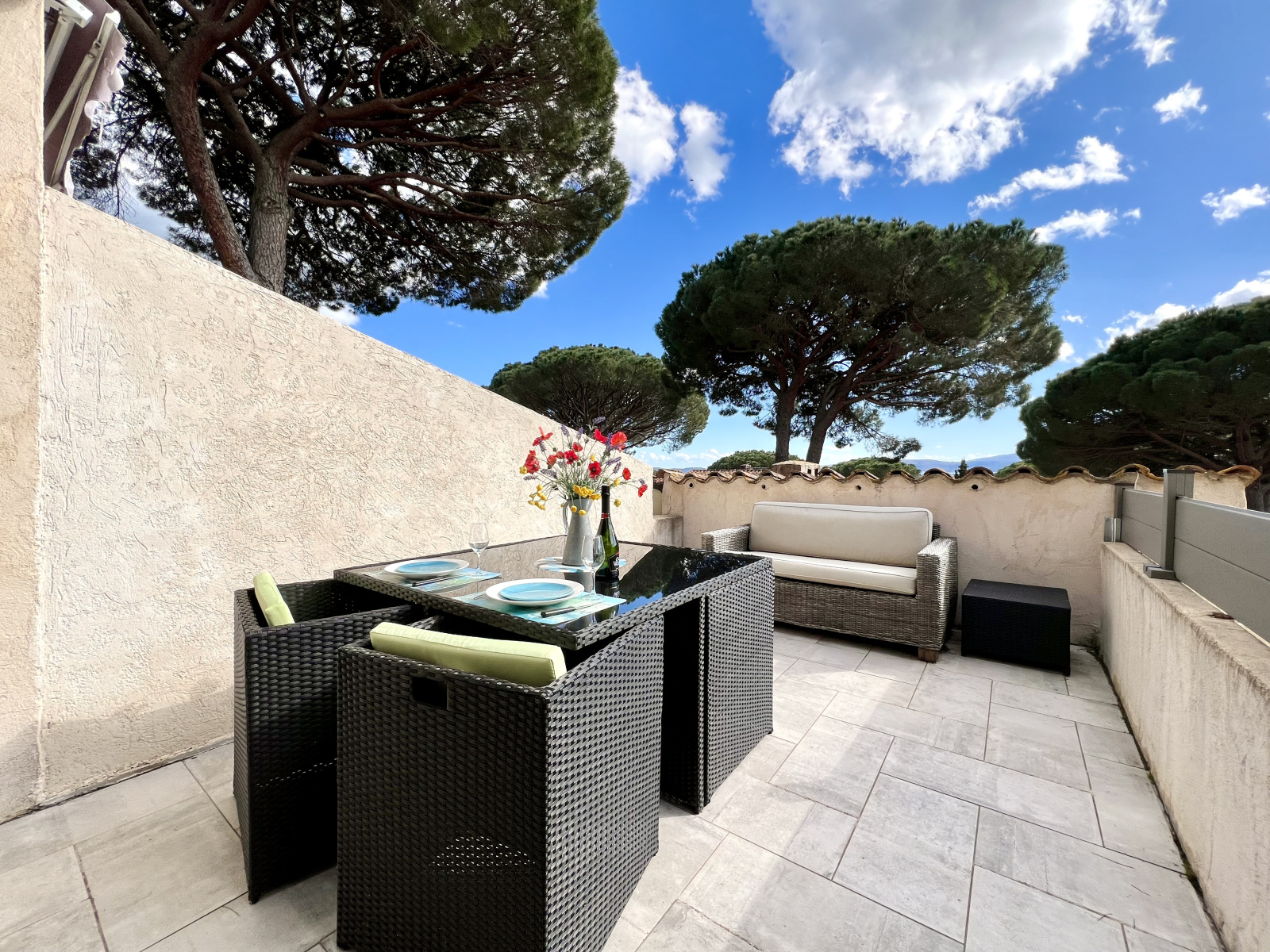 Vous pourrez profiter de son jardin entre soleil et mi ombre selon les moments de la journée, ainsi que de sa terrasse au SUD avec vue sur espace vert et aperçu mer au travers des pins parasols.