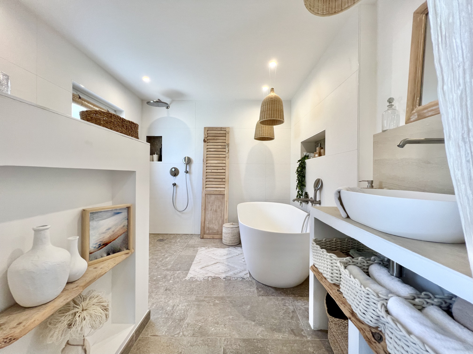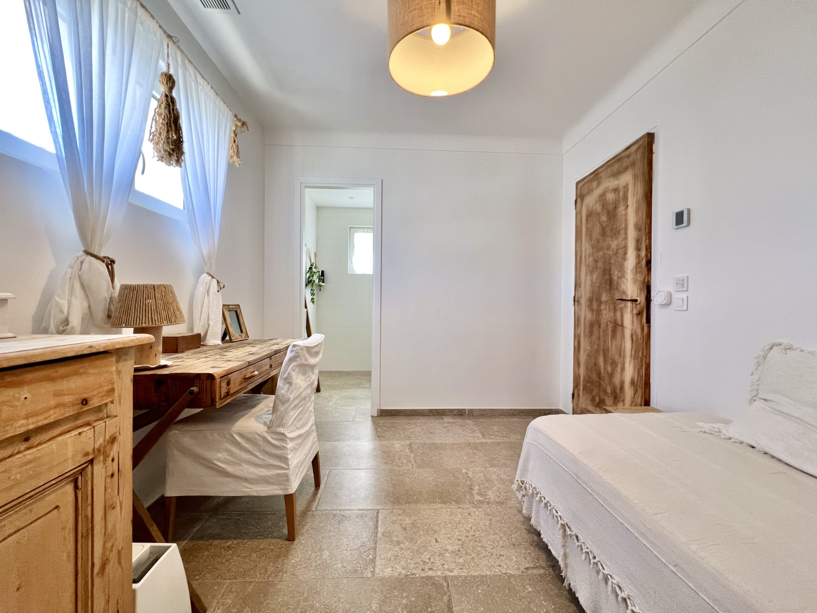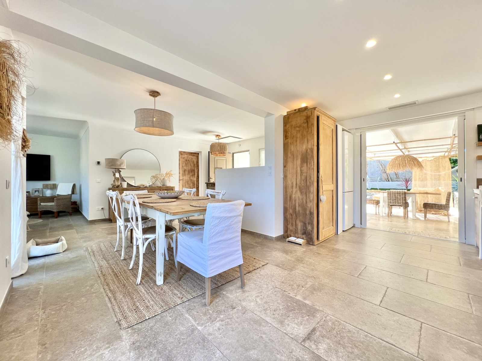 Ce bien parfaitement adapté à son environnement vous propose au rez-de-piscine : un hall d'entrée, une salle de séjour - salle à manger - cuisine américaine ouvrant sur une terrasse couverte à l'EST avec coin plancha, salle à manger et salon d'été, puis espace détente piscine - barbecue et sur une terrasse à l'OUEST avec vue dégagée sur les collines, un coin nuit ou bureau n°1 avec salle de douches, un wc individuel.