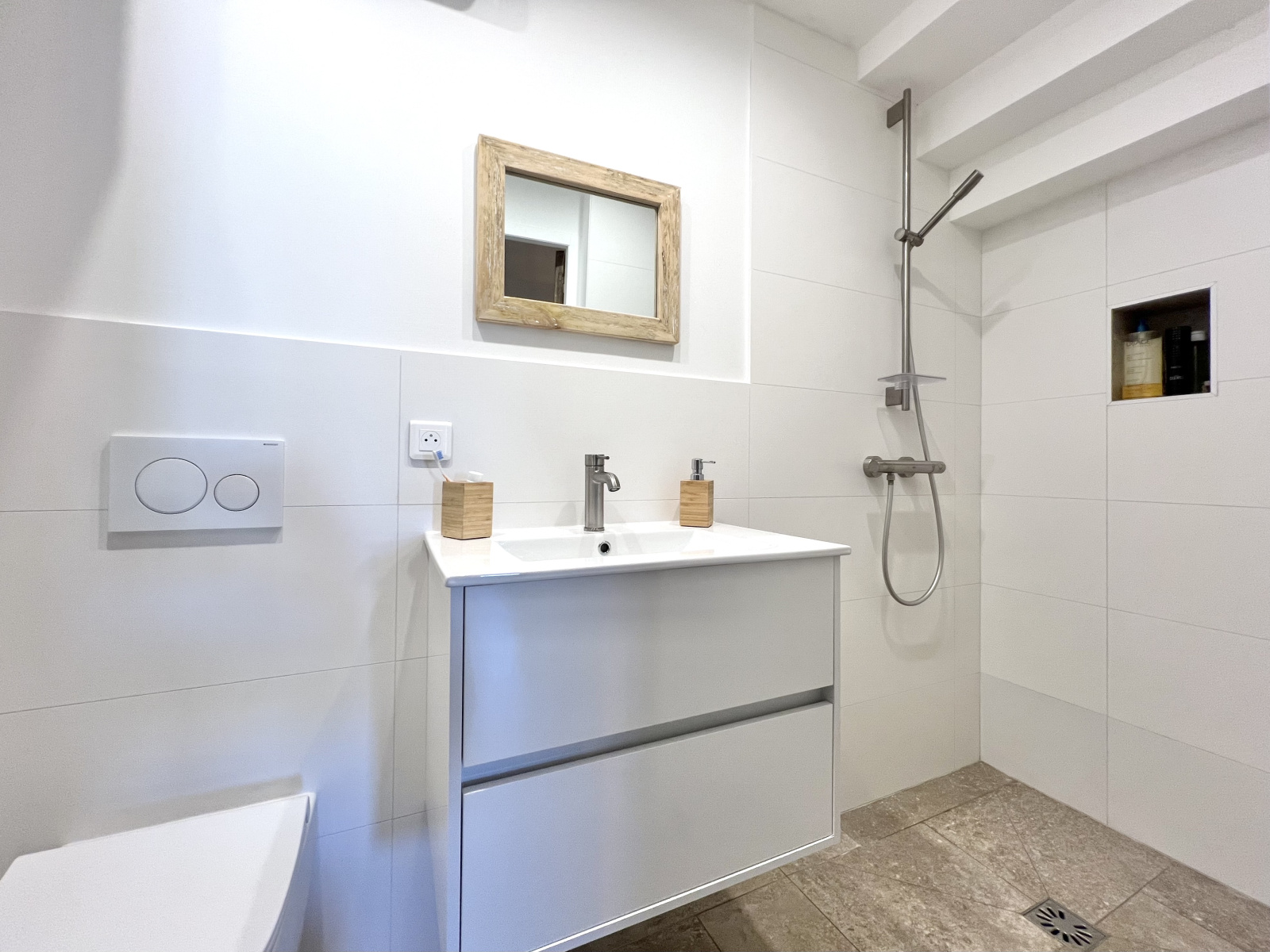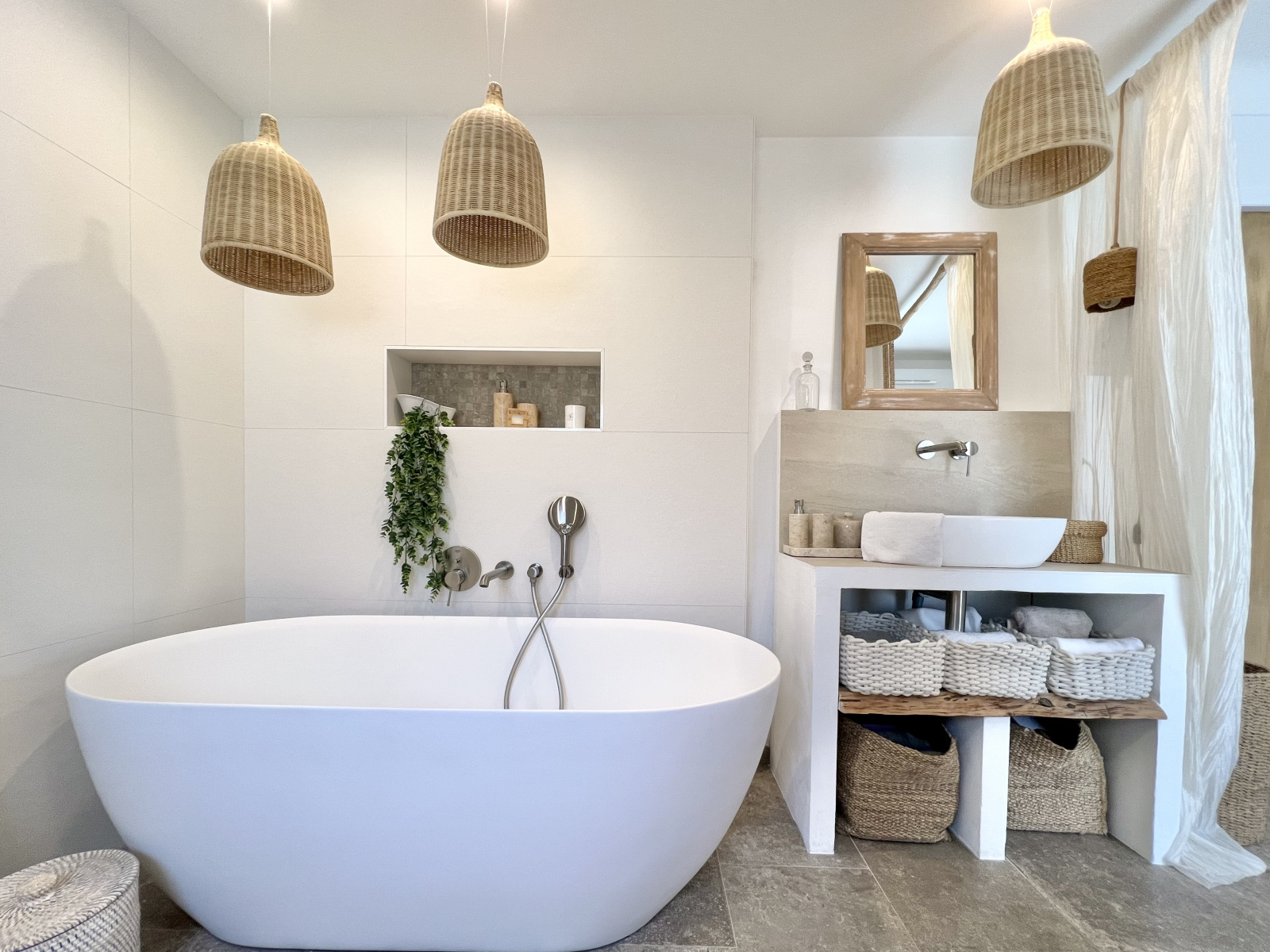 Au rez-de-chaussée par lequel on accède par un escalier intérieur : un couloir de dégagement, une chambre n°2 en suite parentale avec salle de bains et douche, wc, une chambre n°3, une salle de douche avec wc, un garage carrelé avec espace lingerie - buanderie et coin technique.