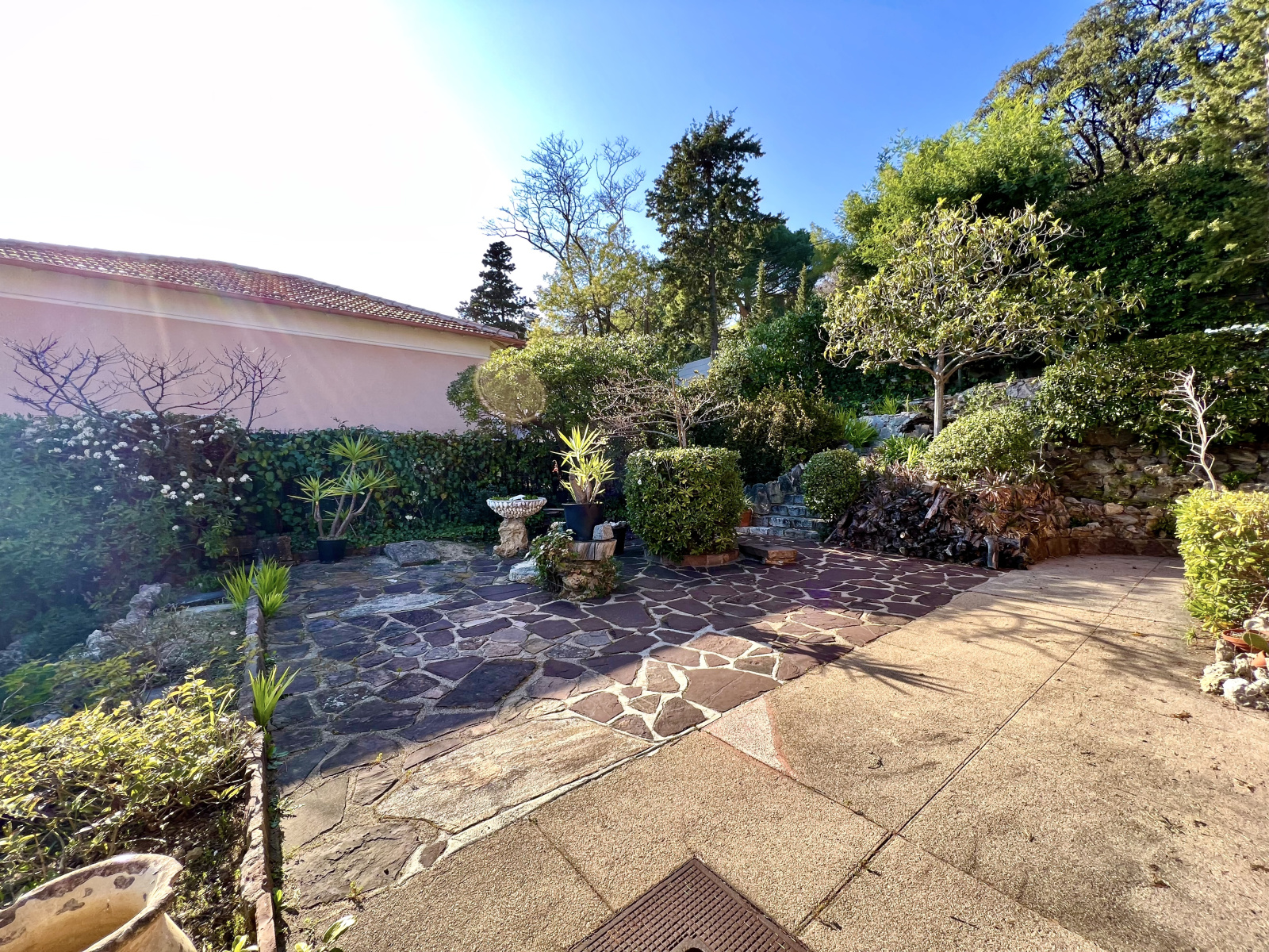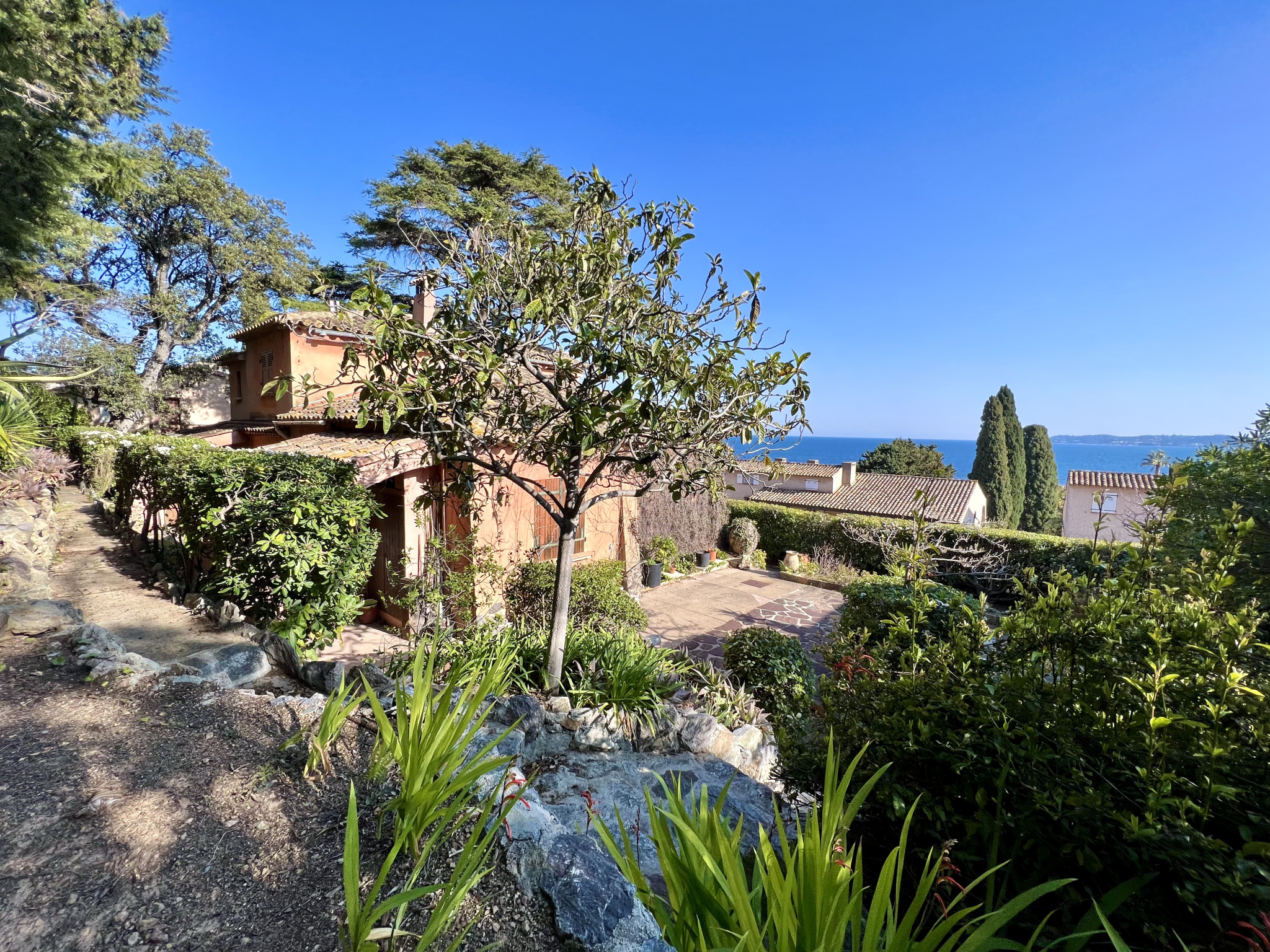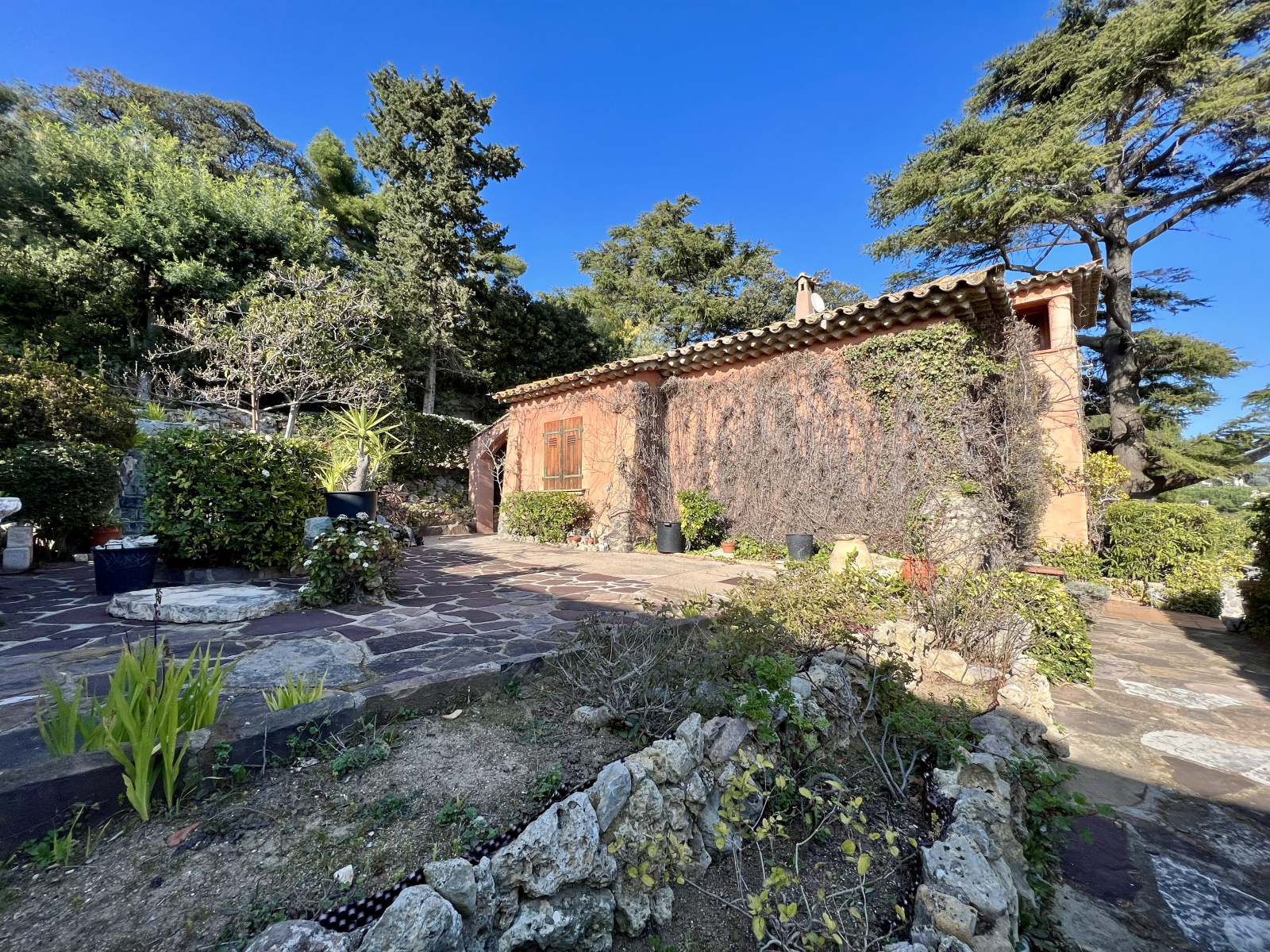 à l'étage : deux chambres dont une avec dressing et petite loggia, d'une salle de bain avec wc. Au rez-de-chaussée : d'un garage, d'un local chaufferie et atelier, d'une petite cave. Pour l'extérieur : jardin complanté d'essences méditerranéennes, grands arbres centenaires, terrasses et coin barbecue.
