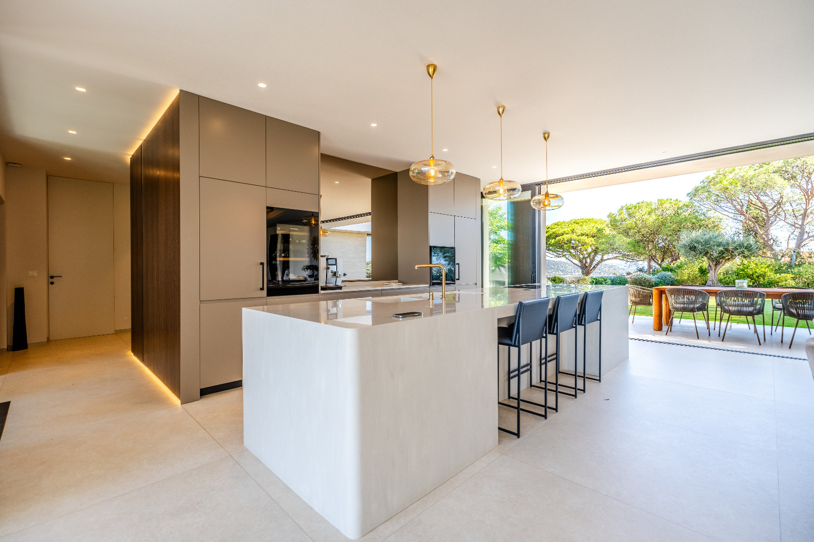 La cuisine au style épurée se distingue avec un magnifique ilot en Corian de plus de 4 mètres de long, celle-ci dispose aussi d’une vaste arrière cuisine fermée.