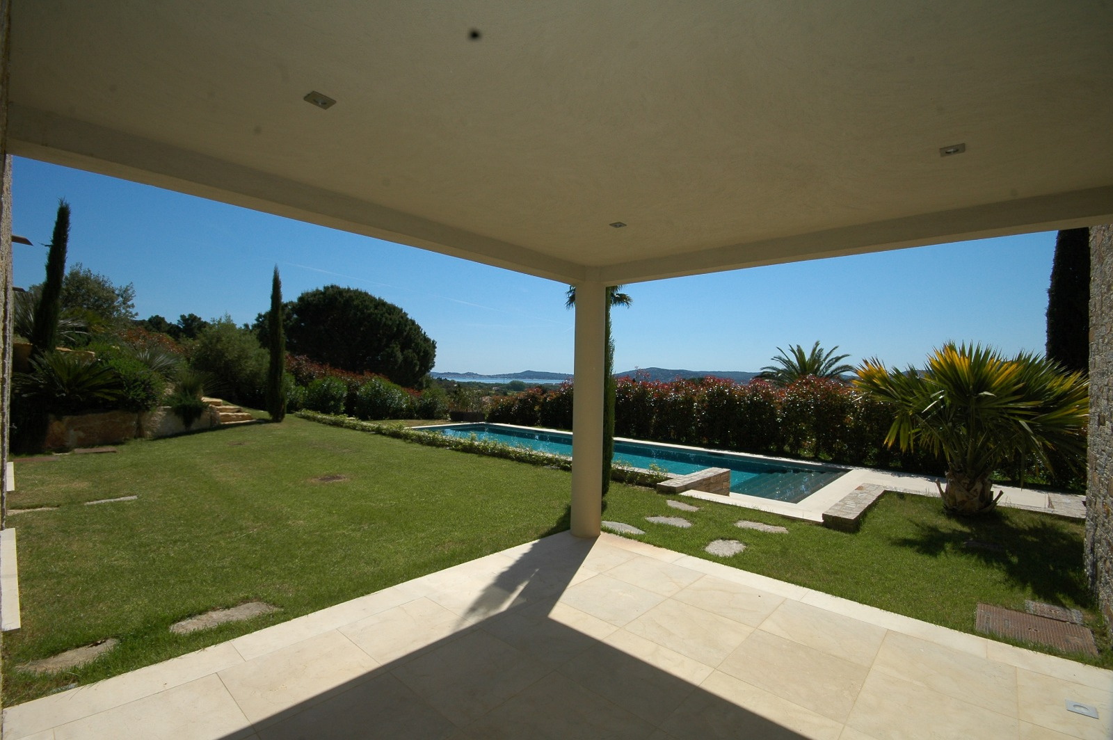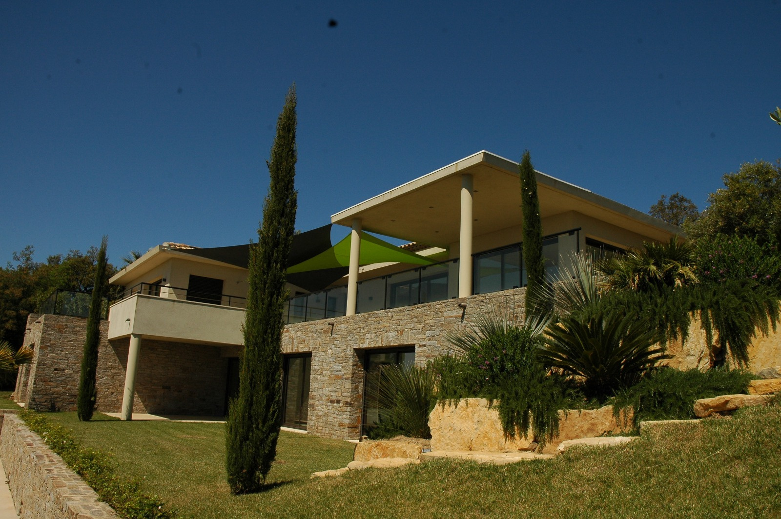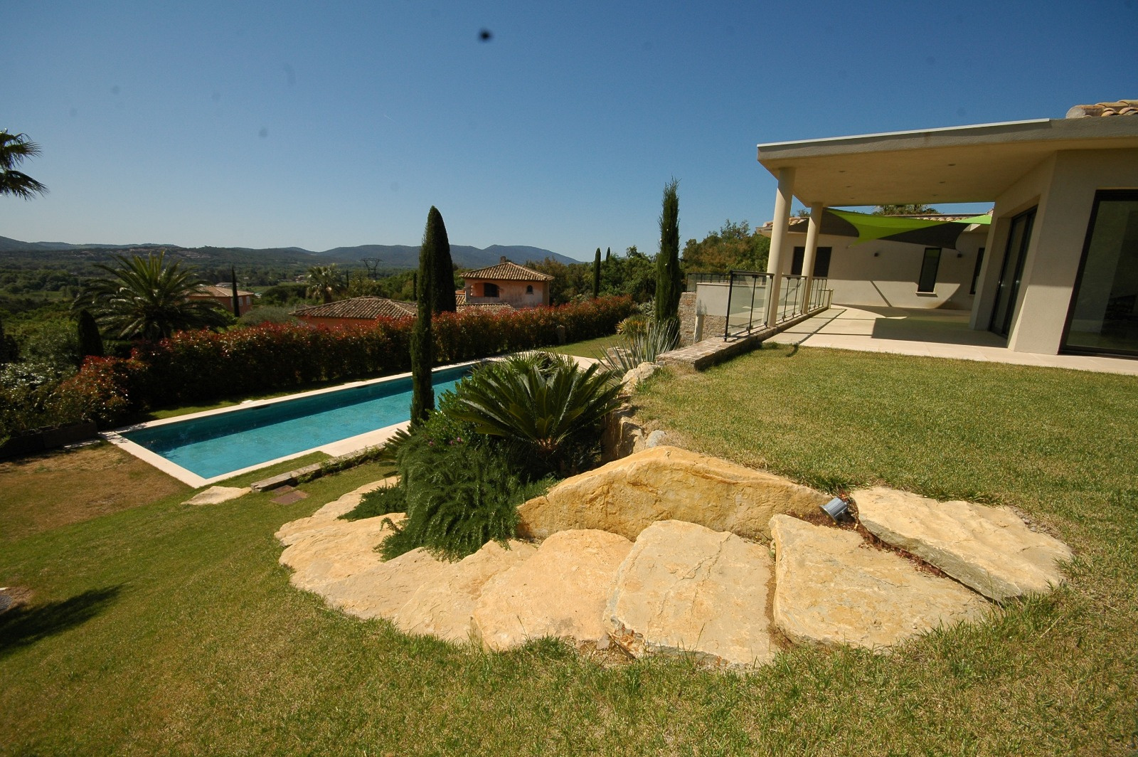Prestigieuse villa de construction neuve dans l'esprit contemporain en parfaite harmonie et en symbiose avec le jardin et son environnement, mais également avec une sublime et dominante vue sur mer et la plaine de Grimaud.