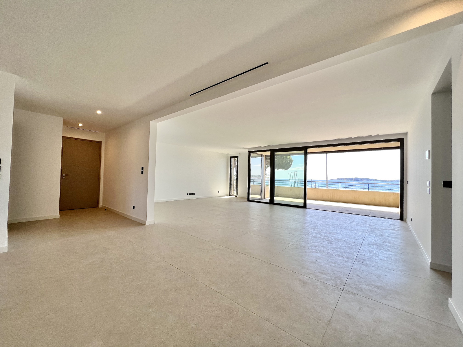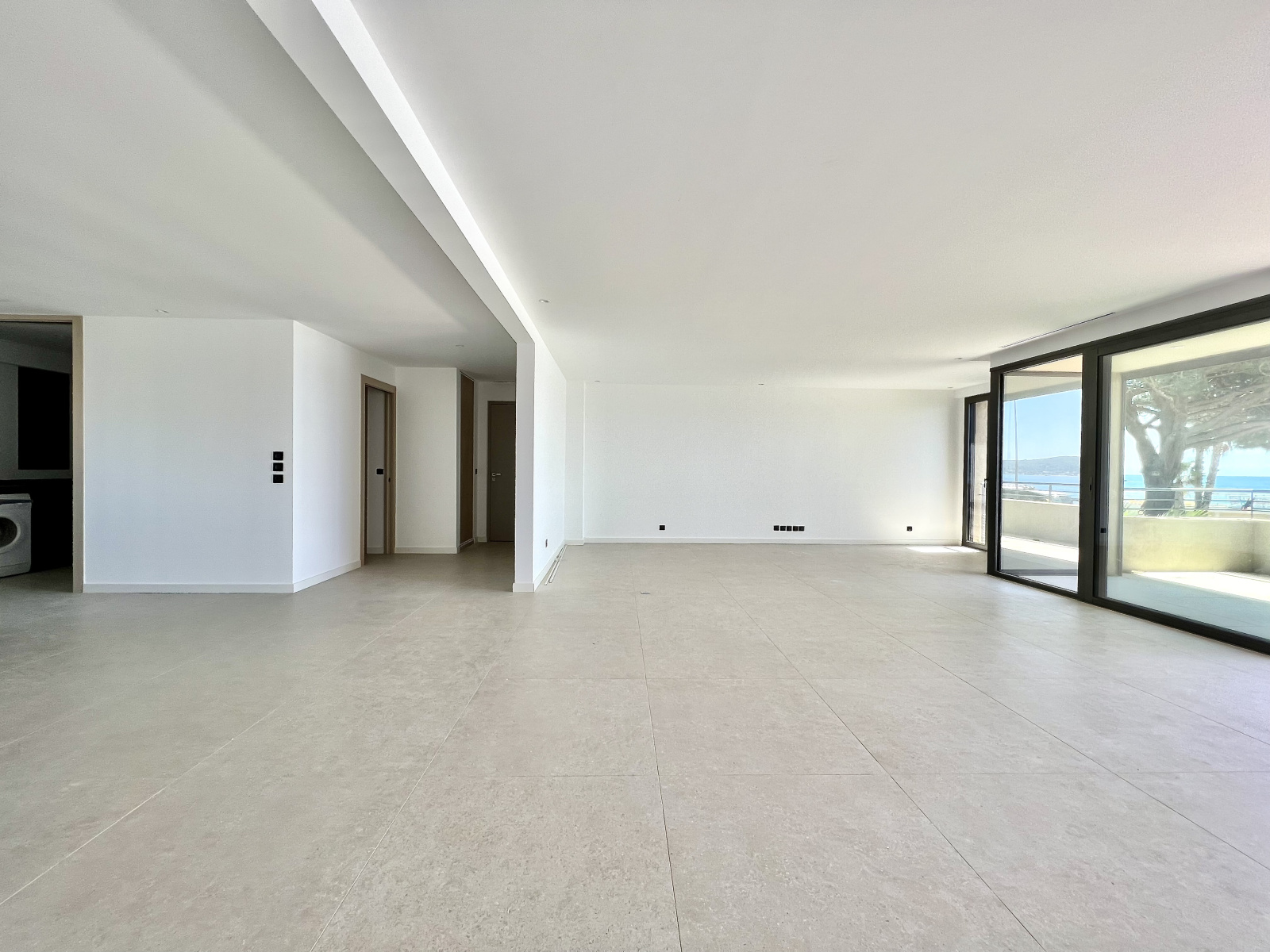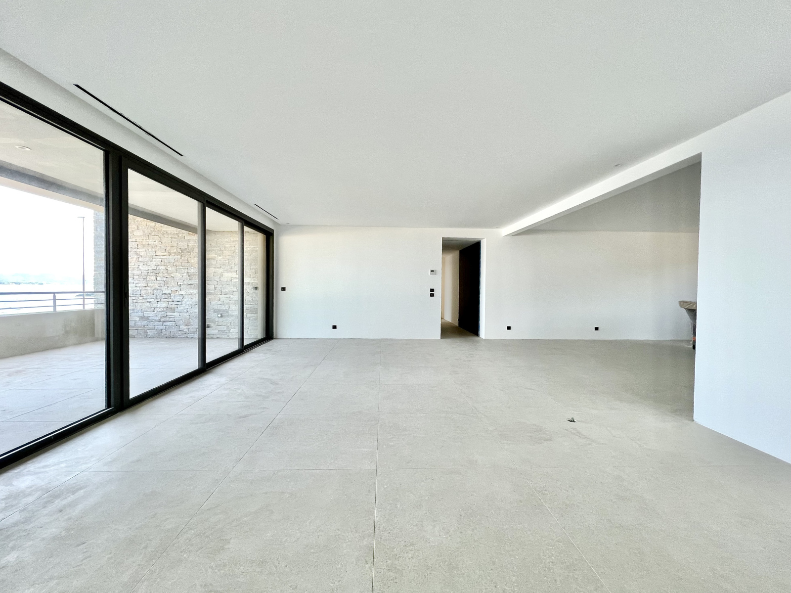 Un appartement comprenant un hall d’entrée avec vestiaire et cabinet de toilette invité, une cuisine ouverte avec office cuisine, une salle de séjour ouvrant sur terrasse au SUD et vue mer panoramique, une aile nuit composée de : couloir de dégagement, chambre n°1 de Maître avec dressing, salle de douche et wc, terrasse privative et vue mer panoramique, chambre n°2 avec salle de douche et wc. Pour une superficie habitable sur plain d’environ 154,85m2.
