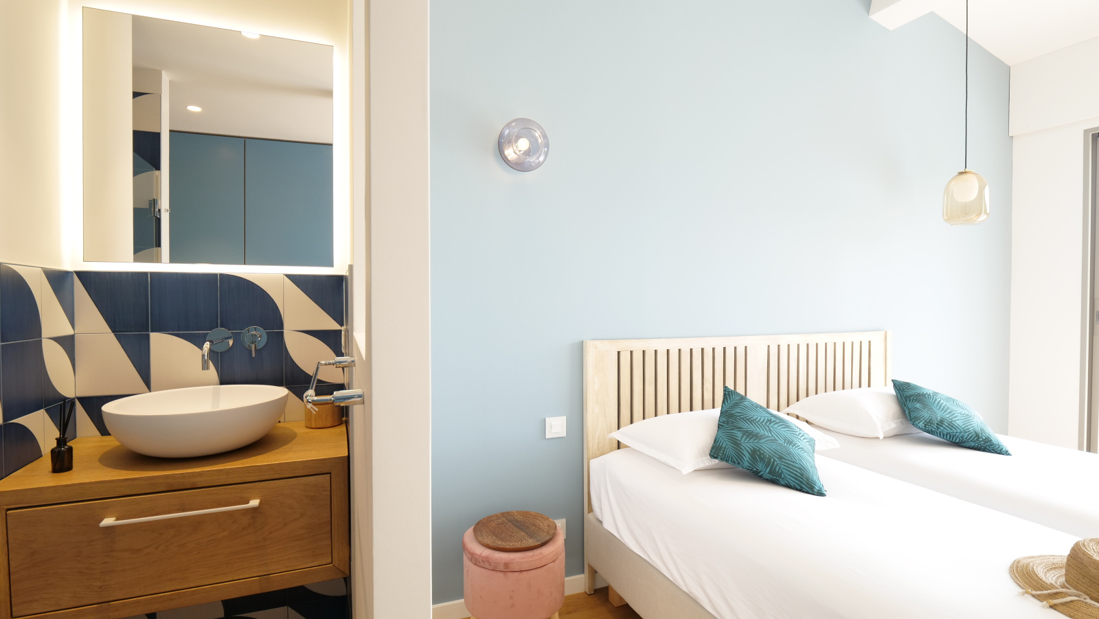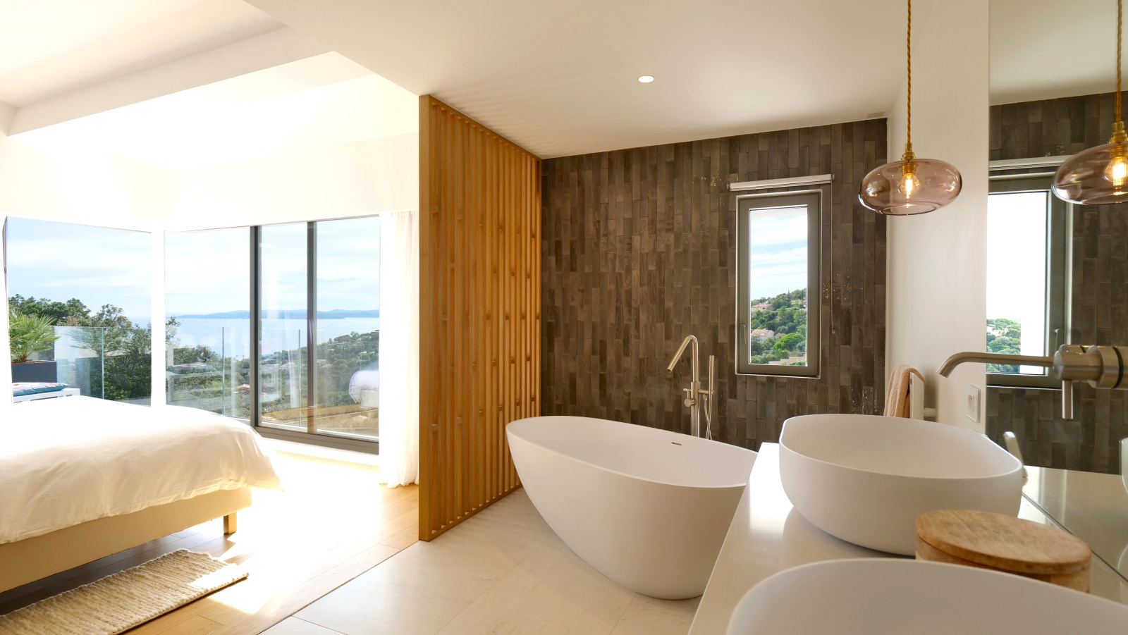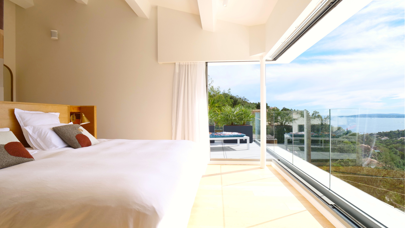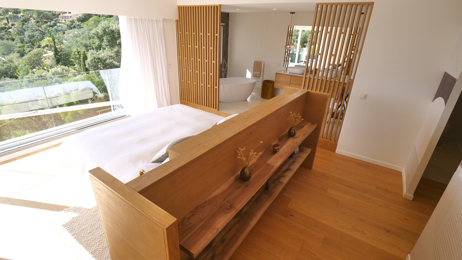 A l'étage : Grande suite de Maître dotée d’une large baie vitrée ouvrant sur le golfe de Saint Tropez, avec terrasse privative, salle de bain, douche et wc, dressing Madame et Monsieur. Chambres n°4 et 5 en suite avec terrasse, salle de douche et wc.