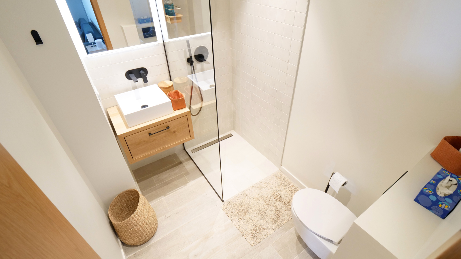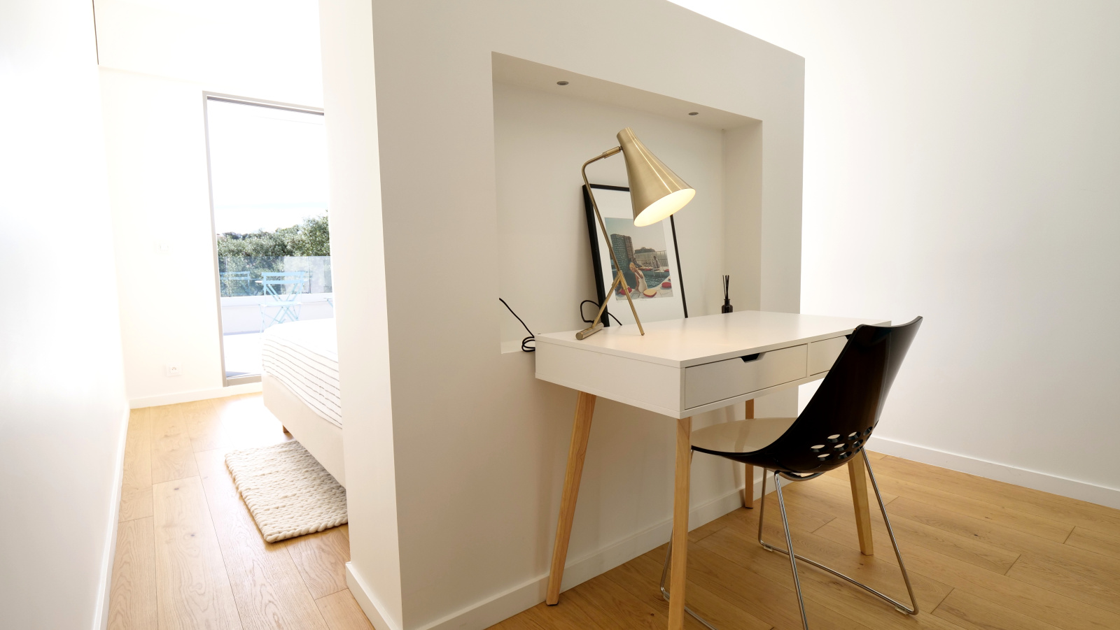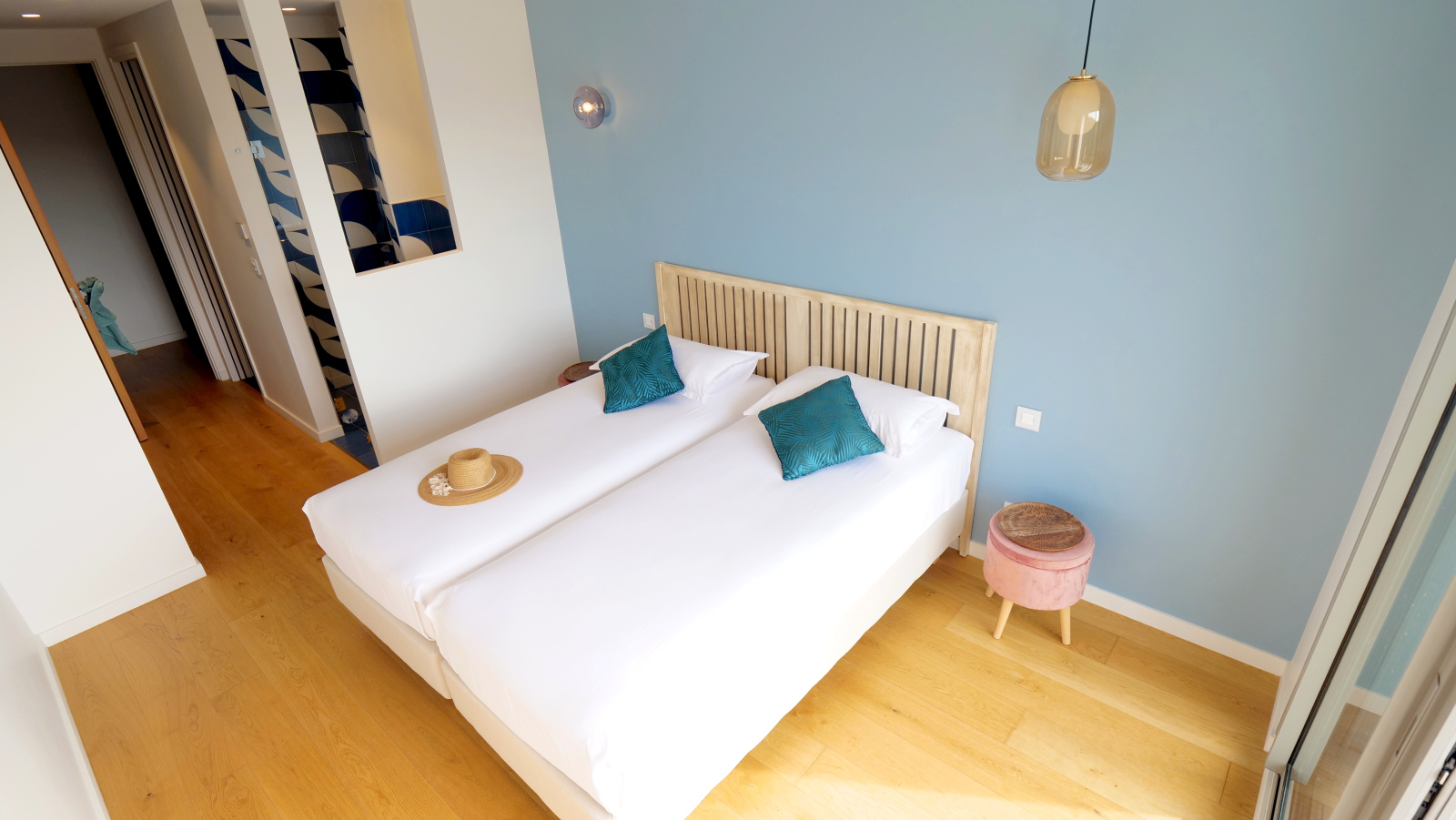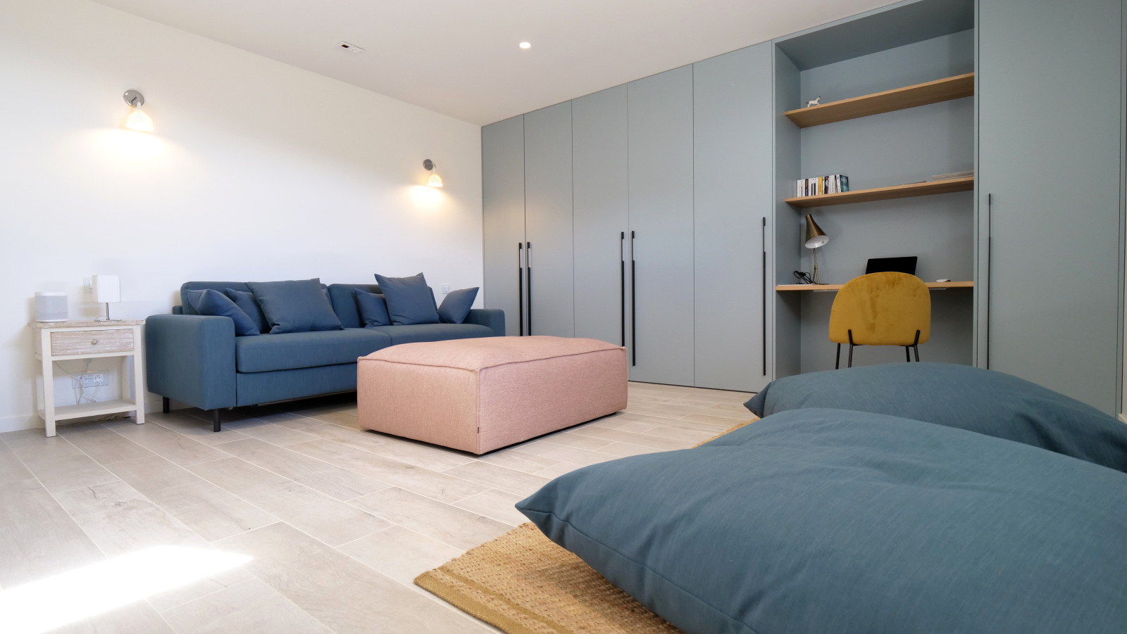A l'étage : Grande suite de Maître dotée d’une large baie vitrée ouvrant sur le golfe de Saint Tropez, avec terrasse privative, salle de bain, douche et wc, dressing Madame et Monsieur. Chambres n°4 et 5 en suite avec terrasse, salle de douche et wc.